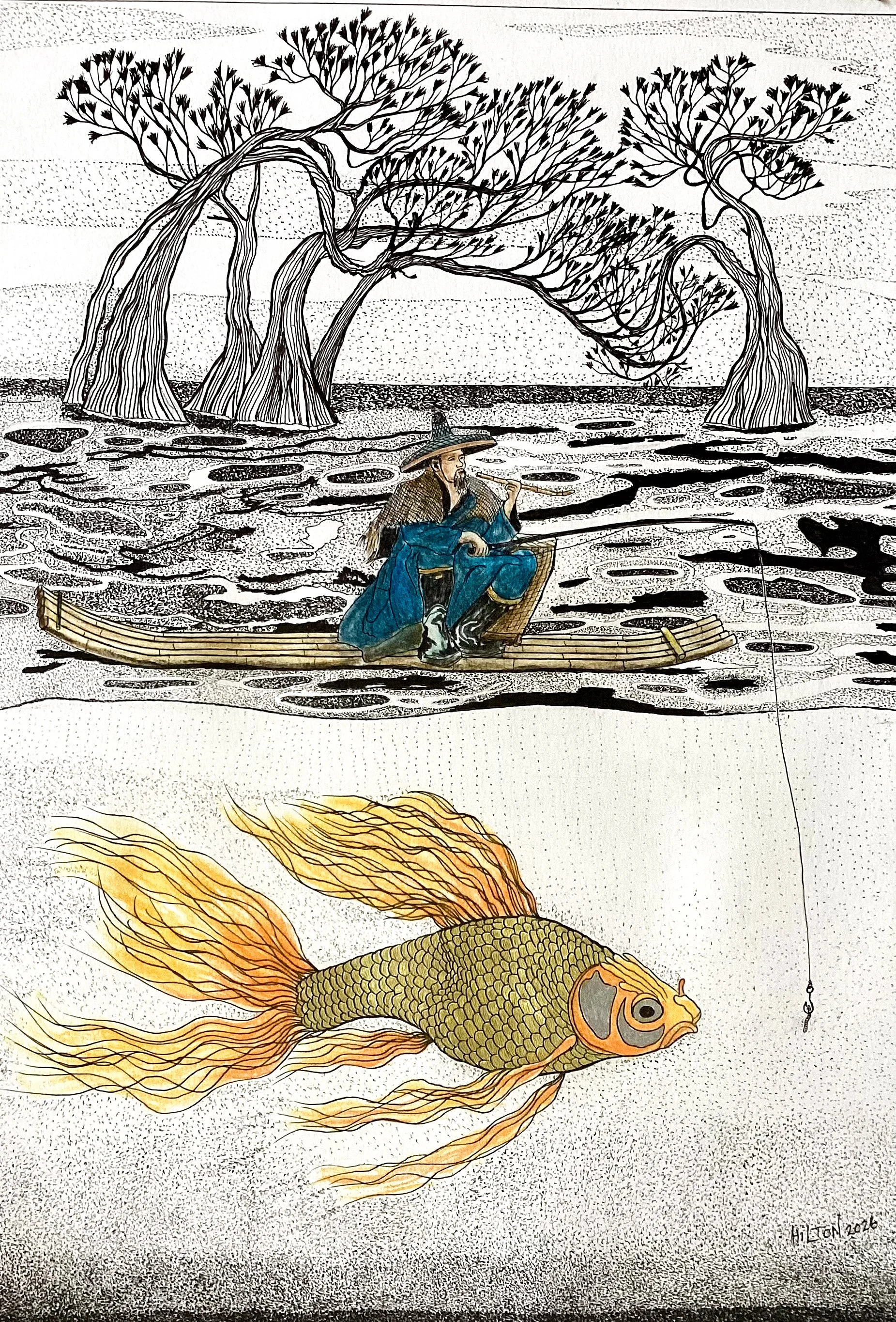 “ The Fisherman’s dream - The Golden Koi “ 42cm x 30 cm, ink with touch of soft pastel, premium French paper, 2026